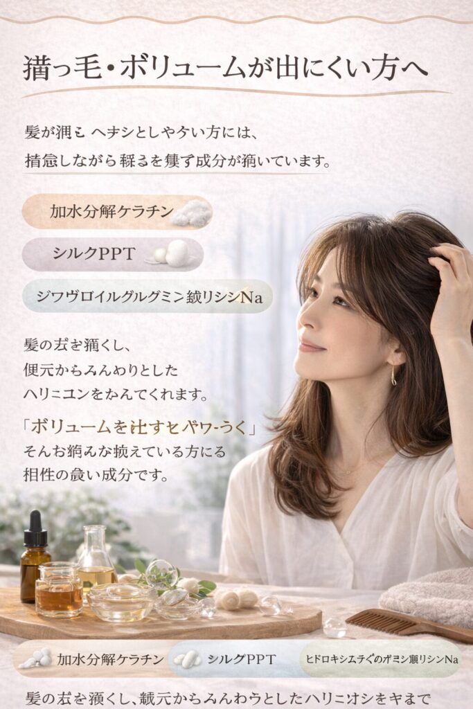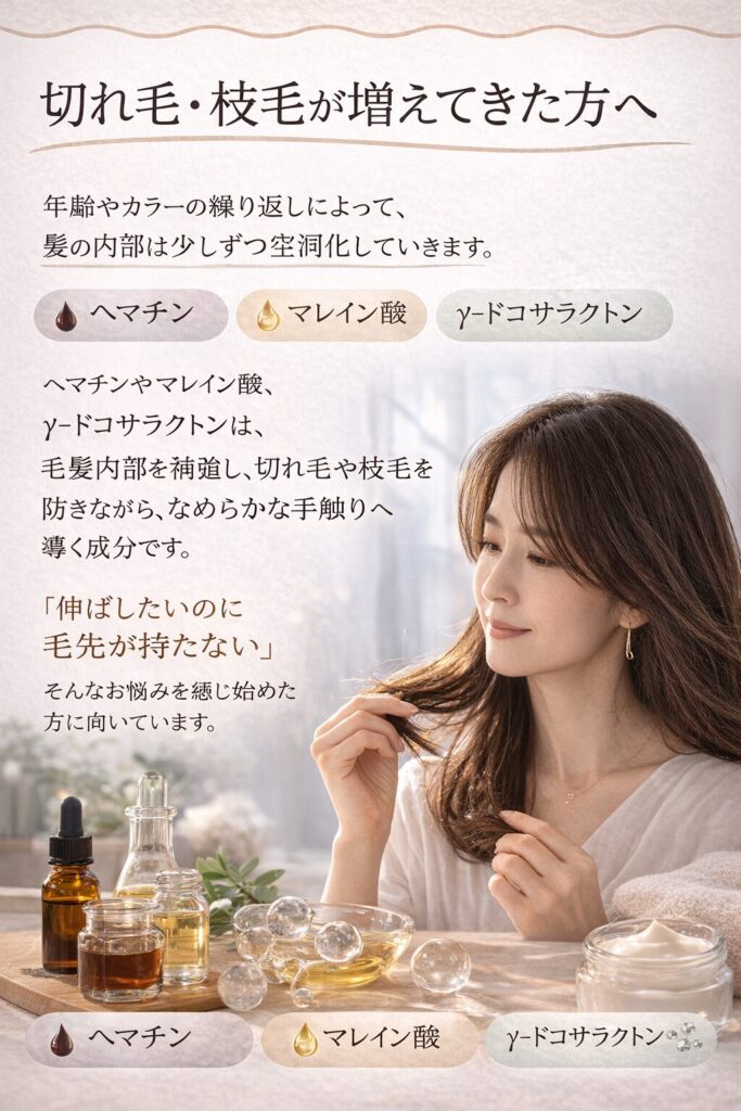 今回は、髪のお悩み別に「どんな成分が向いているのか」を分かりやすくご紹介します。