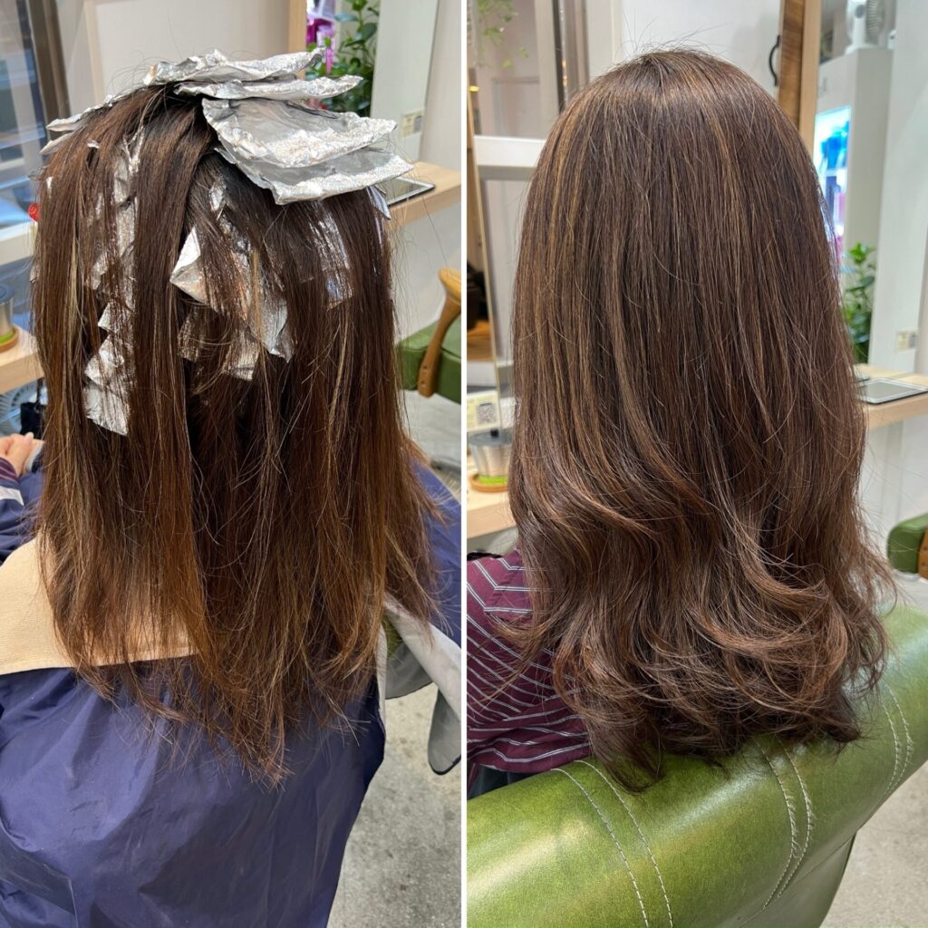 全体を明るくするのは抵抗がある方でも、ハイライトなら 必要な部分だけに明るさをプラス できるため、髪色に立体感と柔らかさが生まれます。