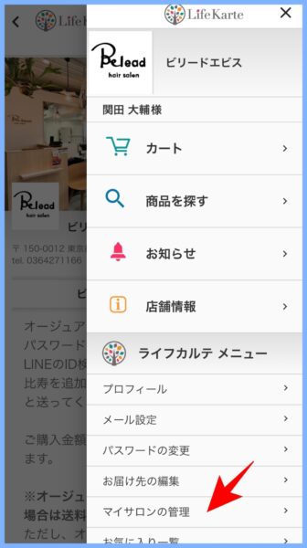 メニューが開いたら、【マイサロンの管理】 を選びます。