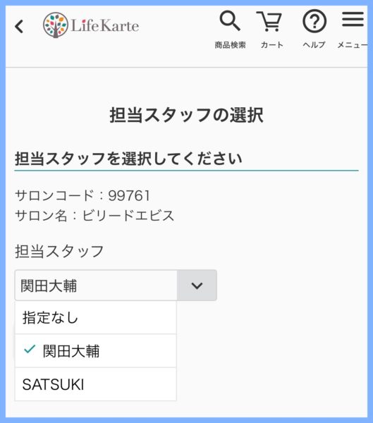 次の画面に切り替わりましたら、担当スタッフを選択する欄が表示されます。