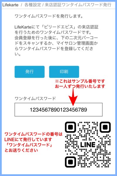 LINEで「ワンタイムパスワード」と送っていただくと、専用コードが返信で届きます。
