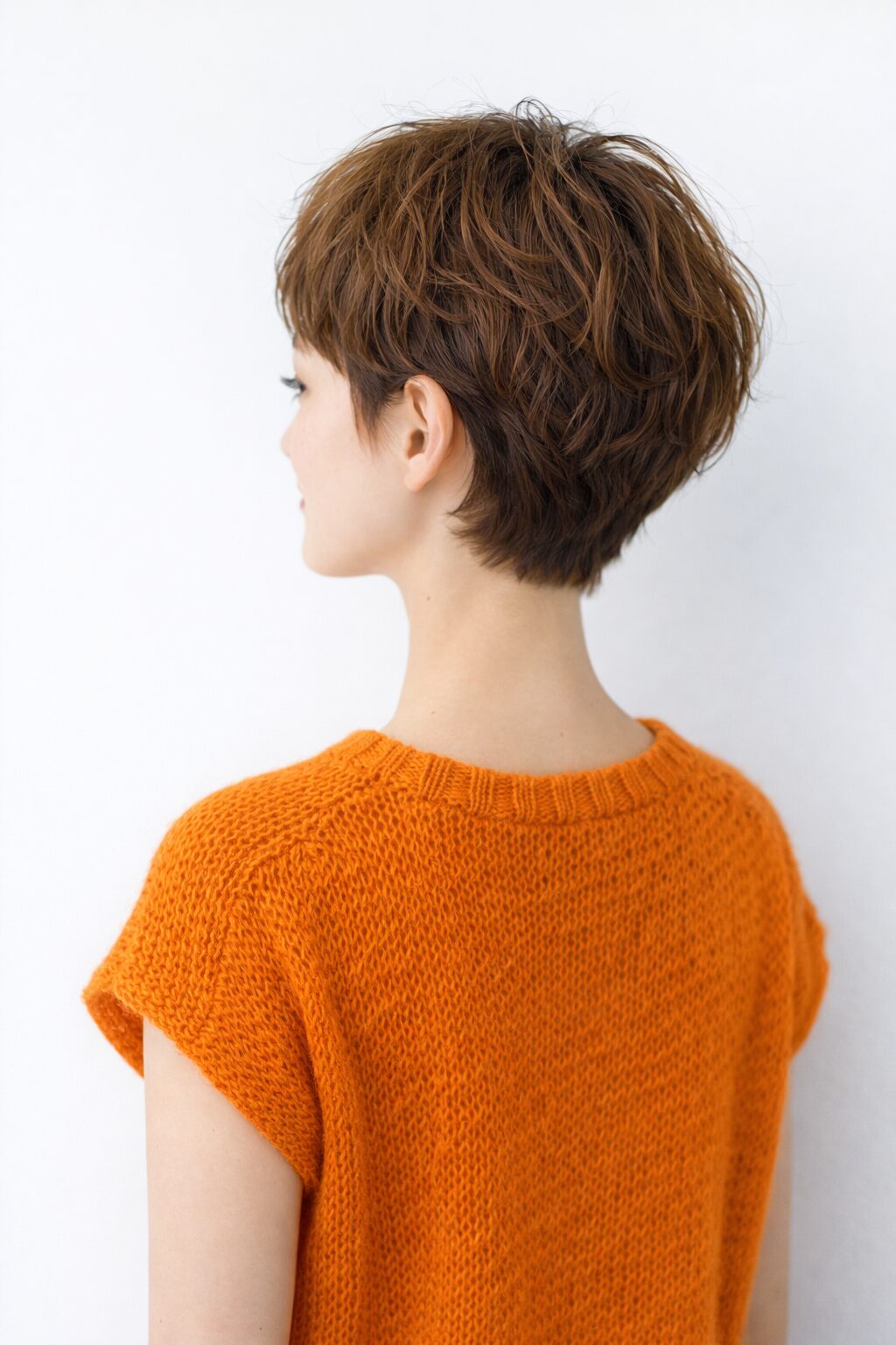 軽やかさとやわらかな動きを大切にした大人女性向けショートスタイルです。 トップから表面にかけて自然なレイヤーを入れることで、ふんわりとした立体感と空気感が生まれ、短くても女性らしいやわらかな印象に仕上がります。 髪質の変化でボリュームが出にくくなってきた方や、ショートにすると硬く見えやすい方にもおすすめです。 白髪が気になり始めた方にも、暗くしすぎず自然になじむカラー設計と相性がよく、軽やかで明るい雰囲気を保てます。 短くしても柔らかさを失わない、大人世代に似合うショートです。
