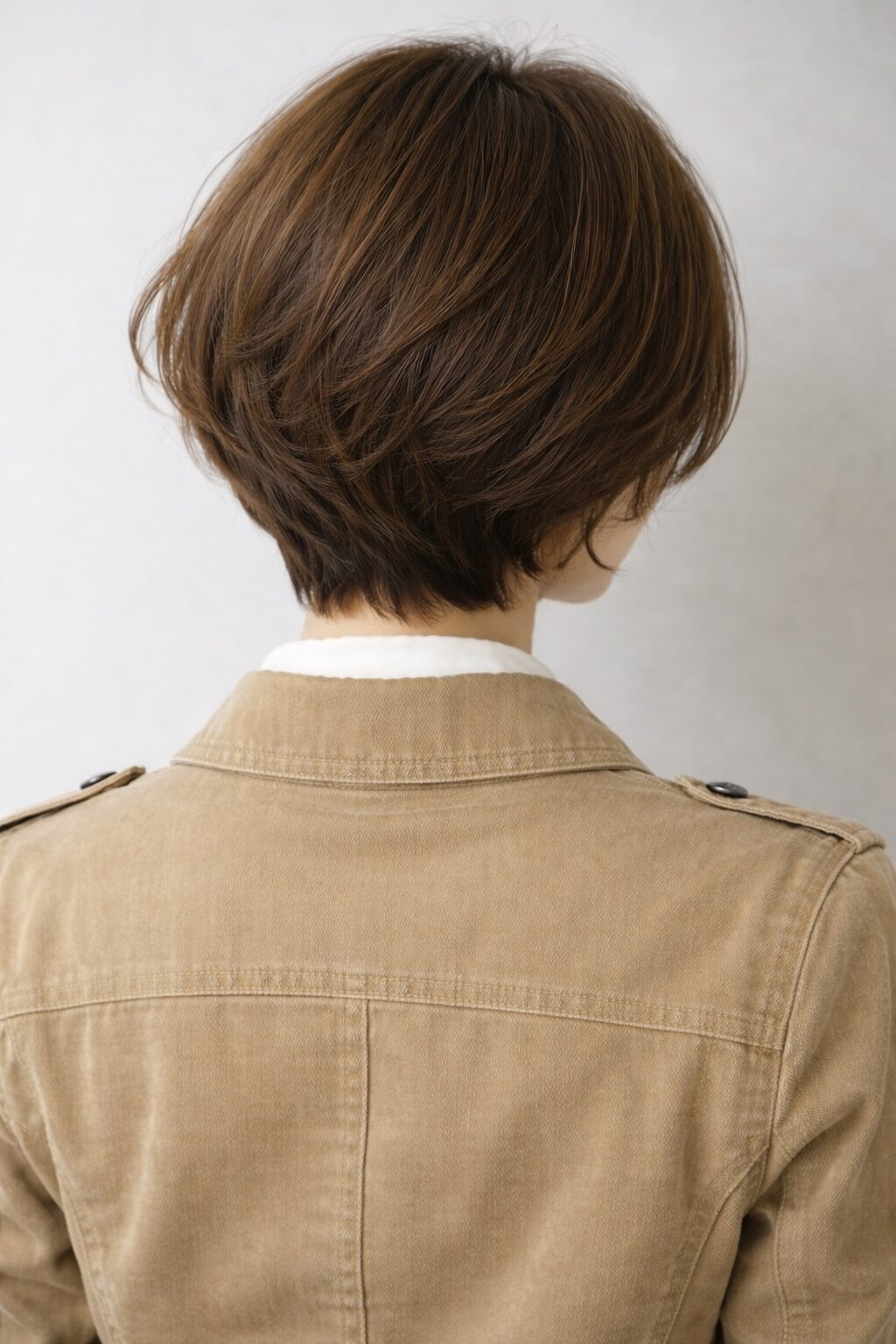 短すぎず女性らしさを保てる長さ設計で、若作りにならない上品ショートに仕上げています。